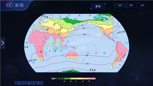 海陸變遷、天氣變化等動態性的變化,這些概念的形成過程復雜,學生理解起來有一定的困難,虛擬仿真技術虛擬再現各種地理環境,模擬真實演變過程,讓過程的發生呈現在眼前,提高地理教學的趣味性。如海陸的變遷,模擬大陸的漂移,形象化展示變遷的過程;氣溫的變化與分布、降水的變化與分布等,將全球不同時期的氣溫分布、雨量分布等以圖像的形式表現出來,從而對它們進行學習和探究。