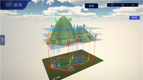 云幻科教VR地理仿真實驗資源制作等高線的地形模型,使用不同顏色標注不同海拔的等高線,便于學生理解等高線地形圖的繪制原理,通過不同的地形模型,引導學生認識各種地表形態的名稱、特點,輕松學習地理知識。
