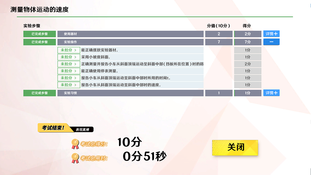 考試模塊按照真實初中理化生中考實驗內容制作,設置評分系統,當學生操作完實驗之后,系統會根據學生操作的每一個環節、每一步給出評分,評分詳情中展示學生的扣分項與得分項,同時通過AI數據分析,分數曲線,錯誤分布,得分詳情等多形式展示測試數據,輔助學生了解自己的不足之處。學生可以通過實驗結果分析自己的實驗操作過程,反復練習,保障實驗操作滿分完成。