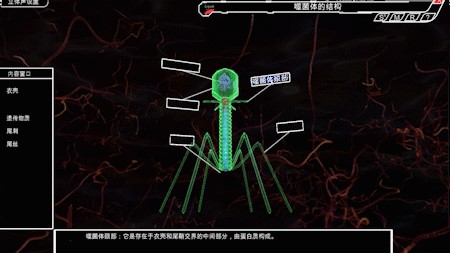 在VR互動教學資源中,《病毒》課程包含視頻、互動、練習三個部分,教師可以通過播放視頻讓學生們了解病毒的類型、結(jié)構(gòu)、繁殖等相關(guān)知識,其次可以通過互動部分內(nèi)容對病毒的結(jié)構(gòu)進行拆解學習,了解每個部位的功能設(shè)置等,最后可以通過練習部分回顧本節(jié)課的主要內(nèi)容以及進行測評,評估學習者本節(jié)課知識內(nèi)容的掌握程度。