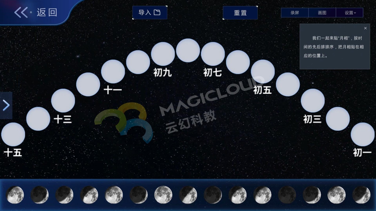 在常規教學中,一般教學環節為畫月相、給月相排序、模擬月相變化、觀察白天的月相等。教學環節中會遇到一些問題,如所畫月相是否正確、天氣影響無法觀察月相、觀察周期較長等等。VR科學仿真實驗平臺可以融入常規課堂教學環節,讓課堂教學變得更豐富、更有趣。