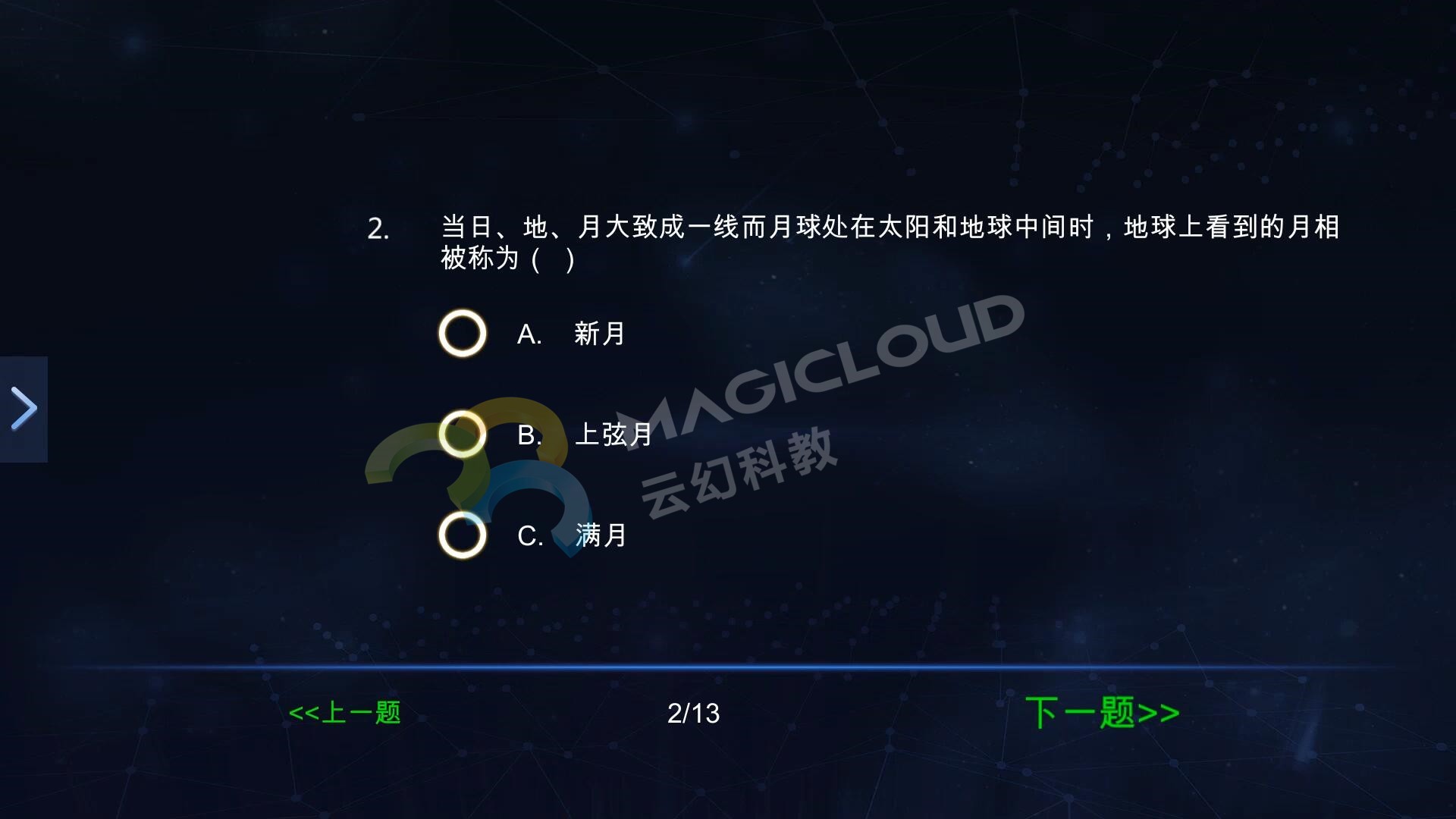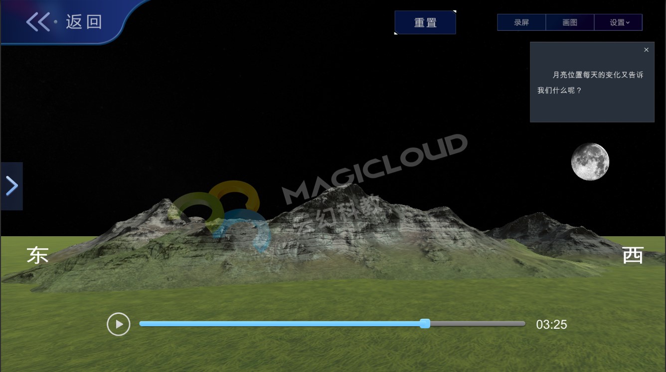 在月相變化教學中,月相變化的原理光憑教師的口頭講解,學生是很難理解的。這一主題屬于宏觀范疇,難以直接觀察,同時小學階段的學生空間想象能力不強,涉及到運動的內容時,就會更難理解。因此在教學中需要準備較多的模擬實驗、教學視頻資料等,此時就需要教師活用多媒體進行教學。那么有沒有哪款軟件貫穿整節課知識內容方便教師教學呢?答案當然是有的,云幻科教VR科學仿真實驗平臺。