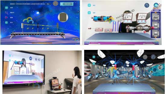 按照國家課程標準實驗要求,將中學物理難懂、抽象且復雜的實驗運用3D建模及AR技術營造虛實合一的實驗場景。顯示虛擬輔助線,彌補真實實驗中無法觀察的信息;智能記錄實驗數(shù)據(jù),以便進行實驗數(shù)據(jù)驗證;無限次數(shù)重復進行實驗操作加深印象。