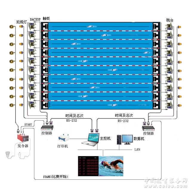 這套設備適用于長50米或25米,泳道寬2.5米游泳池。能完成50米,100米,200米,400米,800米,1500米項目的單項或接力比賽的計時工作。