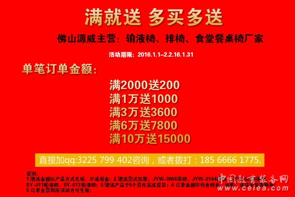 看到這條貼的時(shí)候,請(qǐng)您不要驚訝!此信息是真的!是佛山源威從2003年至今為止第一次讓利活動(dòng)促銷.最高讓利點(diǎn)達(dá)15%,心動(dòng)不如行動(dòng)。具體活動(dòng)規(guī)則如下: 一、單筆訂單金額: 滿2000送200; 滿1萬送1000; 滿3萬送3600; 滿6萬送7800; 滿10萬送15000; 多買多送; 溫馨提示:如果您的單筆訂單金額不滿足贈(zèng)送條件時(shí),可補(bǔ)差額預(yù)留作下筆訂單費(fèi)用。 二、規(guī)則: 1.贈(zèng)送金額以產(chǎn)品方式兌現(xiàn),不返現(xiàn)金; 2.贈(zèng)送款式僅限:JYW-0068排椅,JYW-0144排椅,JYW-0266排椅,SY-011輸液椅,SY-013輸液椅; 3.贈(zèng)送產(chǎn)品于6個(gè)月內(nèi)完成提貨; 4.訂單金額不包含稅金,運(yùn)輸,送貨安裝等費(fèi)用; 5.訂單全款到賬活動(dòng)方可生效; 6.活動(dòng)期限:2016年1月1日至2016年1月31日。活動(dòng)有期限,且行且珍惜!