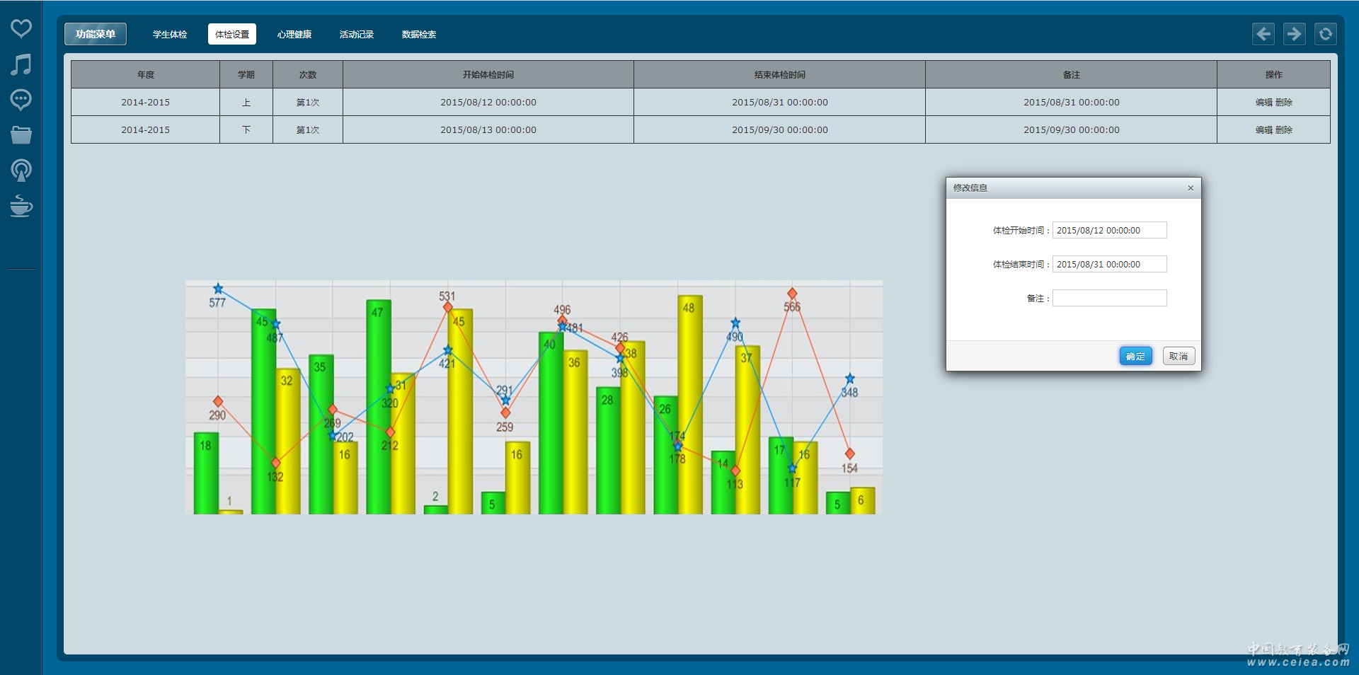 健康教育計(jì)劃 包含對(duì)教育計(jì)劃項(xiàng)目的設(shè)置,同時(shí)包含了針對(duì)計(jì)劃項(xiàng)目階段性的設(shè)置(計(jì)劃資料信息及文件的添加上傳),同時(shí)還包含教育計(jì)劃的分類管理。 健康教育安排 對(duì)設(shè)置的教育計(jì)劃進(jìn)行人員培訓(xùn)范圍和時(shí)間的安排通知。 課時(shí)計(jì)劃 對(duì)安全教育計(jì)劃設(shè)置相應(yīng)的課時(shí)安排,課時(shí)是時(shí)間段控制檢測(cè)登陸學(xué)習(xí)人員信息。 健康教育考核 包含導(dǎo)入考核試卷,人員在線作答,在線評(píng)分,成績(jī)公布,不及格補(bǔ)考學(xué)習(xí)。 常見(jiàn)病防治 定期錄入常見(jiàn)病及相應(yīng)的防止措施,采用共享的模式,統(tǒng)計(jì)瀏覽、下載次數(shù)。 學(xué)生體檢 包含體檢項(xiàng)目的設(shè)置(年度學(xué)期、體檢開(kāi)始時(shí)間、體檢結(jié)束時(shí)間、備注),學(xué)生體檢信息錄入,采用自動(dòng)關(guān)聯(lián)學(xué)生的方式針對(duì)學(xué)生牙齒、血壓等進(jìn)行學(xué)生的體檢登記。 心理健康 構(gòu)建學(xué)生心理健康檔案,制定心理健康檢查內(nèi)容模板,通過(guò)智能對(duì)比分析,實(shí)時(shí)監(jiān)測(cè)學(xué)生心理健康現(xiàn)狀,極大的方便學(xué)校對(duì)學(xué)生心理數(shù)據(jù)的收集,整理與規(guī)范。 綜合分析 包含對(duì)學(xué)生的健康進(jìn)行的分析、健康教育方案實(shí)施的統(tǒng)計(jì)分析等。 |