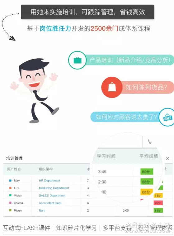 產品詳細介紹培訓管理系統 (1)、學習和培訓需求管理 學習和培訓需求是組織培訓實施的方向,根據組織的培訓目標和要求,向部門或員工征集培訓需求,員工主要根據崗位或績效要求目標,提出想要參加的需求信息。 (2)、學習和培訓計劃管理 培訓管理依據培訓需求報告,崗位、績效等客觀需求,針對一定范圍內的員工,擬定各項培訓的計劃,作為組織實施培訓的依據,實現對時間、課程、經費、教師、場地、合同等統籌管理。并可通過系統對學習和培訓計劃的進度狀態隨時統計和調整,督促員工學習和培訓,以確保學習和培訓效果。 (3)、培訓資源管理 培訓資源主要對系統內涉及到培訓的課程、題庫、教師、教學設備、獎品等培訓管理。實現培訓部門對培訓資源的統一計劃、調配管理。 (4)、培訓實施管理 培訓實施管理是培訓組織者按照擬定的培訓計劃、項目需求、績效要求等培訓任務組織執行的培訓活動。培訓實施是人才培養的學習階段,參與培訓實施的員工、教師、管理人員參與執行系統角色實現的學習活動或培訓管理業務活動模塊。 (5)、在線考試管理 采用最新Web2.0技術和Ajax技術,強調與用戶的交互,更加人性化; 提供了全面的試卷支持(錄入/導入/上傳); 提供快速高效的試卷自動導入輔助程序; 支持單選題、多選題、判斷題、填空題、問答|計算|分析等各類文字題和圖片題; 支持錄入各種文字、圖片和表格內容; 支持每題每空單獨計分、支持答錯扣分、支持錯選少選全選分別計分等各種計分方式; 支持系統自評分和手工閱卷; 自動保存答卷和成績供隨時查閱; 支持互聯網上的虛擬班級概念,可以進行統一地考試、閱卷和成績管理等; 自動臨時保存機制可以有效防止意外斷電、死機造成的考試中斷; 以樹形結構來管理所有科目,以科目為單位來管理試卷和考試,極大的方便用戶使用。 (6)、培訓評估管理 提供需求、計劃、實施模塊執行的各項數據的統計分析; 提供對個人、機構;從微觀和宏觀多角度查詢統計分析; 提供崗位、技能、課程關聯的數據管理分析; 提供文字、圖形;基于WEB的圖文并茂的統計報表。 (7)、基礎數據管理 系統對機構、人員等基本屬性的定義管理; 實現對角色、職務、權限、素質模型等系統基礎信息的定義、分配、維護調整等管理。 |