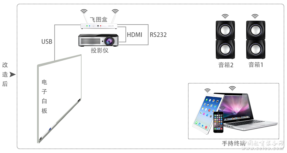 飛圖盒對教室的無線改造 把飛圖盒安裝在短距投影儀上方;飛圖盒的USB接口連接電子白板,RS232接口連接投影儀的控制接口,HDMI接口連接投影儀的HDMI接口;老師上課用的電腦可以更換為手機或平板,通過WiFi與飛圖盒連接;原來的有線音箱更換為無線WiFi音箱,飛圖盒把獲得的音頻信號直接發射給WiFi音箱。 老師上課時,有兩種情況:一是老師在電子白板上書寫,此時電子白板把老師的書寫軌跡通過USB線傳輸給飛圖盒,飛圖盒通過內部軟件繪制出書寫軌跡,傳遞給投影儀,投影儀把軌跡投射到電子白板上。由于時間非常短暫,所以我們就感覺是實時書寫出的軌跡;另一種情況是老師通過移動智能終端播放教學課件,整個屏幕內容被WiFi同步無線發射給飛圖盒,飛圖盒把視頻信息通過HDMI線纜傳遞給投影儀,把音頻信號通過WiFi傳遞給無線音箱,從而實現了對教室的無線改造。 教室采用飛圖盒進行無線教學改造,把必須坐在講桌前操作電腦的老師解脫出來,可以在學生中間自由走動,近距離的觀察學生,與學生互動,促進了老師與學生之間的充分交流,對學生的學習狀態有更細致的觀察和了解。降低了學生對老師的敬畏感。這個變化也正好符合國家教改,向先進教育強國學習的要求。