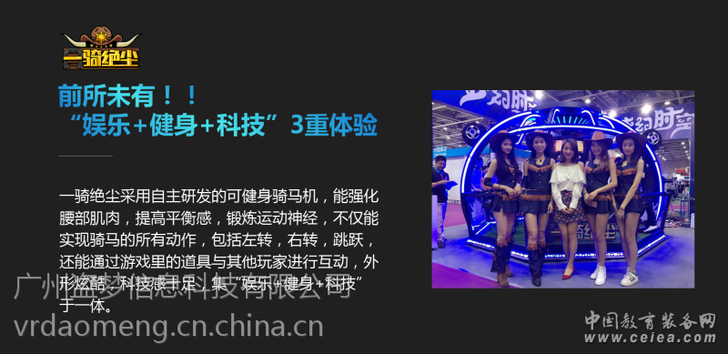 產品詳細介紹詳細介紹: 全球首款集娛樂、健身、科技為一體的8人同時在線競速類VR游戲設備。 場景多元素融合,一望無垠的沙漠地圖、白茫茫的冰雪世界帶您領略不同的空間藝術! 吃道具箱子盾牌護體、加速、減速禁錮對手等融入增添游戲趣味性、可玩性! 手控式操作賽馬左右移動、跳躍增加游戲競技難度! 體感特效吹風、噴水+游戲內場景特效讓你真真切切的沉浸其中! 投資回報率提高,最多支持8人同時體驗,爭創利潤最大化! 營業場所不受限制,商場、主題場館、大型購物廣場等皆可經營!