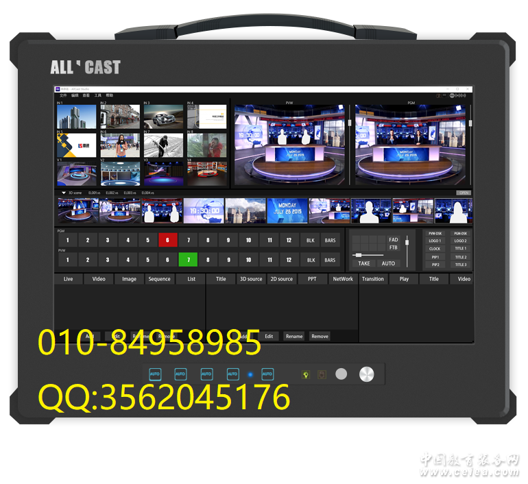 由于【All’Cast】所有信號(hào)源通道可自定義,所以我們做到連接可多達(dá) 8路攝像機(jī),每路輸入都可以設(shè)置色彩校正、摳像、切邊、縮放,并帶有幀同步。可多達(dá) 8 路 DDR 硬盤播放器用于視頻回放,支持大多數(shù)視頻格式和大容量素材回放。另有路數(shù)字媒體播放器用于播放圖片和音頻使用。可多達(dá) 8 通道虛擬用于實(shí)現(xiàn)虛擬演播室效果。 虛擬演播室 01084958985