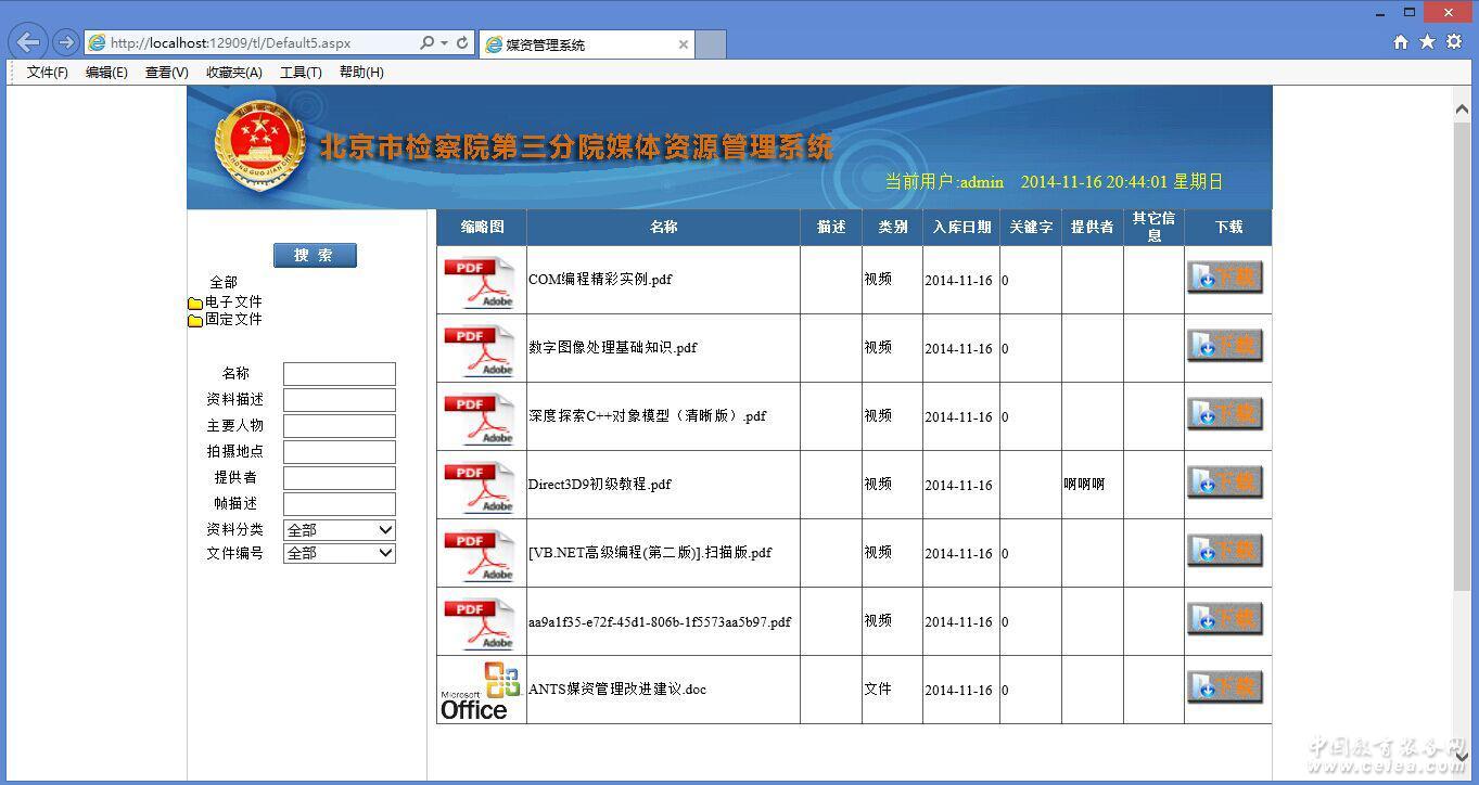 《查詢模塊》《修改》 c/s檢索方式部署,支持多人同時在線檢索; 支持全文檢索,結果呈列表顯示; 提供名稱檢索、時間段檢索、分類檢索、關鍵字檢索、資料描述檢索、視頻文件幀信息描述檢索等多種檢索方式; 支持關鍵字模糊檢索; 獨有的支持以漢字首個拼音字母方式檢索; 選中的文件可以在線預覽內容(視頻、音頻、圖片) 審核與未審核查詢切換 支持授權將文件刪除; 支持授權將文件二次編目(修改)。 《下載模塊》 支持授權將查詢模塊查詢到的文件進行下載; 支持視音頻文件打點下載; 支持批量下載; 《編目審核模塊》 對已入庫的素材進行審核。 支持視音頻素材的預覽; 支持對審核未通過的素材簽署審核意見 《系統管理模塊》 是服務端后臺管理的重要組成部分,是設定人員檢索權限及系統各項設定的重要環節。 設置-包括服務器設置和關鍵字設置; 分類管理-目錄(欄目)分類和關鍵字內容設置; 權限管理-設置用戶按目錄設置訪問權限; |