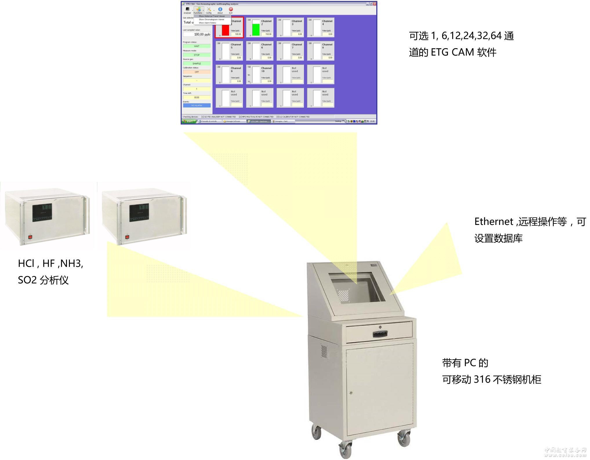 產品詳細介紹獵戶座 3100S 空氣分子污染物監測系統 痕量級AMC空氣分子污染物 Ma Mb(NH3,HCL,HF等)監測---半導體行業應用 光刻工藝潔凈室內痕量級NH3,HCL,HF氣體的超高靈敏度、實時測量 實踐證明深紫外光刻工藝深受多種類微量污染物的影響,對很多微量污染物極為敏感,比如氨氣或者酸性氣體都會給半導體生產帶來極大的危害,盡管隨著深紫外耐腐蝕材料技術的發展,已經減少了長時間持續實時監測,而實際上空氣分子污染(AMC)的實時測量對產品質量的好壞至關重要。 獵戶座3100S系列空氣分子污染物監測系統基于CEAS(腔增強吸收光譜)技術連續分析儀器,將增加半導體器件阻抗一致性、保證更長的過濾器壽命、減少生產過程的停工時間。 ETG HMI(人機交互界面)軟件可以實時觀察、實時測量、實時操作對不同空間不同位置的NH3、HCL、HF進行分析,軟件專門針對半導體行業開發,對于深紫外光刻工藝過程中監測與控制空氣分子污染(AMC)提供有力的支持,軟件集成了多點采樣(MS)控制功能,具有實時顯示數據曲線、報警、存儲、趨勢、歷史曲線、分析等功能。 獵戶座 3100S 系統: 完善的空氣分子污染(AMC)監測 實時監測空氣分子污染(AMC)對于半導體生產過程極為重要。 快速監測、報警、極低濃度測量、寬測量區域、多氣體的高靈敏響應等是半導體工業要求之一。 深紫外光刻工藝特別關注氨、胺類、N-甲基吡咯烷酮NMP、酸類等濃度測量,當這些氣體與化學放大光刻膠反生反應時,將深深的影響半導體器件質量。 傳統古老的方法多采用間接測量分析方法。包括撞擊濾塵器、離子色譜、化學熒光法,這些方法分析速度太慢,操作過程太復雜,昂貴并且測量結果不精確。 ETG采用被證明的CEAS(腔增強吸收光譜)技術解決AMC(空氣分子污染物)監測難題,可快速測量痕量級NH3、HCL、HF,采用脈沖熒光法測量SO2,采用增強型GC-FID測量VOCs。 獵戶座 3100S系列空氣分子污染物監測系統測量痕量級NH3、HCL、HF并集成了uVOC-CAM特性,是半導體行業潔凈室AMC(空氣分子污染)測量的有力工具。 獵戶座 3100S也集成了多點監測系統,可依序將氣體抽送到分析儀或傳感器,并讀出測量結果。獵戶座 3100S內嵌的報警、報告、分析軟件是由多年半導體行業經驗的工程師集體開發。 獵戶座 3100S使用Ethernet、RS485/RS232或4-20mA模擬模塊可以輸出來自4~6臺分析儀或傳感器的數據。 每臺分析儀配有內置計算機(Linux OS),可進行數據存儲和數據輸出,還支持遠程網絡控制,通過互聯網可以連接ETG公司總部或者當地經銷商服務商,進行操作或者診斷。 使用者可以通過網絡瀏覽器比如IE、Chrome等世界任意可以聯網的地方進行操作,遠程操作可實現多級管理權限控制和操作。