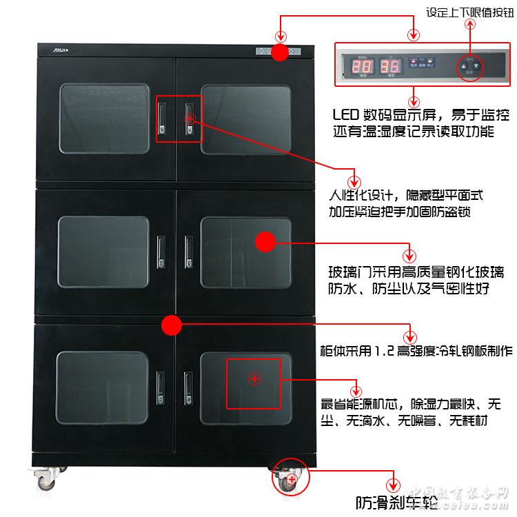 產品詳細介紹浙江SMT芯片防潮柜愛酷防靜電工業防潮箱 型號:AKSS-2000防靜電超低濕防潮柜 廣泛應用于濕度敏感類材料的存放,如電子元件、光學元件、半導體存儲工業光學顯微鏡、文物古董存儲民用防潮箱系列等,如IC、LED、SMT、PCB、MSD、LCD等濕度特別敏感的材料存放。