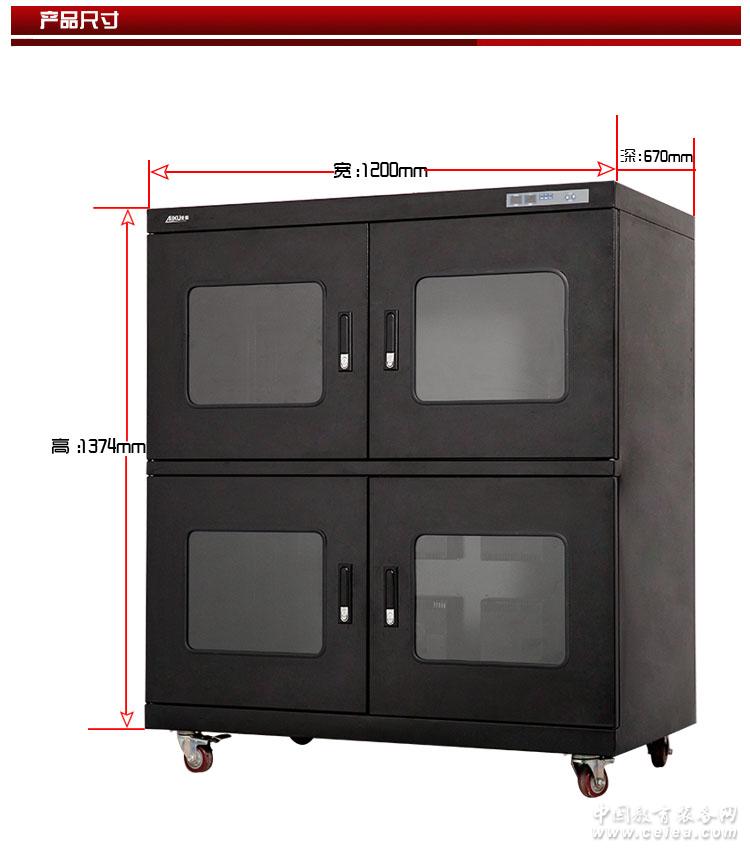 產品名稱 : 快速超低濕防潮箱/柜 型號:AKSS-980 容積:980L 電源:220V/50Hz 全自動除/控濕 ≤5%RH,免倒水、免換耗材,幾乎零故障的精密機械靜音運轉 外形尺寸:W1200*D670*H1374(mm) 內部尺寸:W1198*D645*H1204(mm) 層板數量:3(塊) 平均耗電量:64W 四組萬向腳輪(兩組帶剎車)