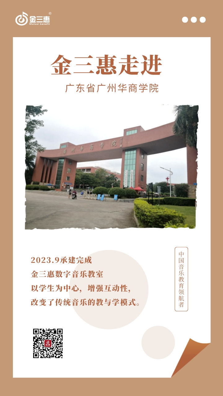 2023年9月,金三惠數字音樂教室走進廣東省廣州華商學院,為學生提供了50+1的電鋼琴教室,配備了金三惠電鋼琴教學系統、電鋼琴、數字音樂教學儀等教學教具等。