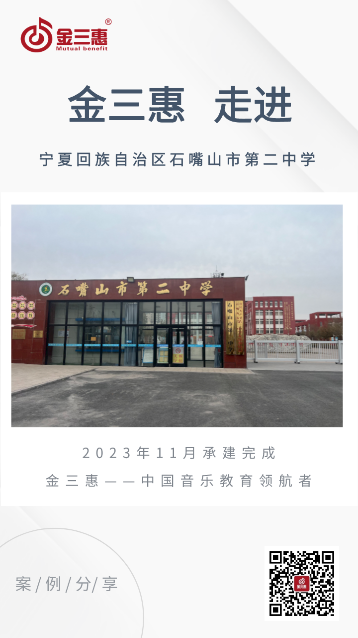 2023年11月,金三惠數字音樂教室走進寧夏回族自治區石嘴山市第二中學,為學校提供了24+1的電鋼琴教室配備了金三惠電鋼琴教學系統、電鋼琴、數字音樂教學儀等教學教具等。電鋼琴室-金三惠 (jinsanhui.com)