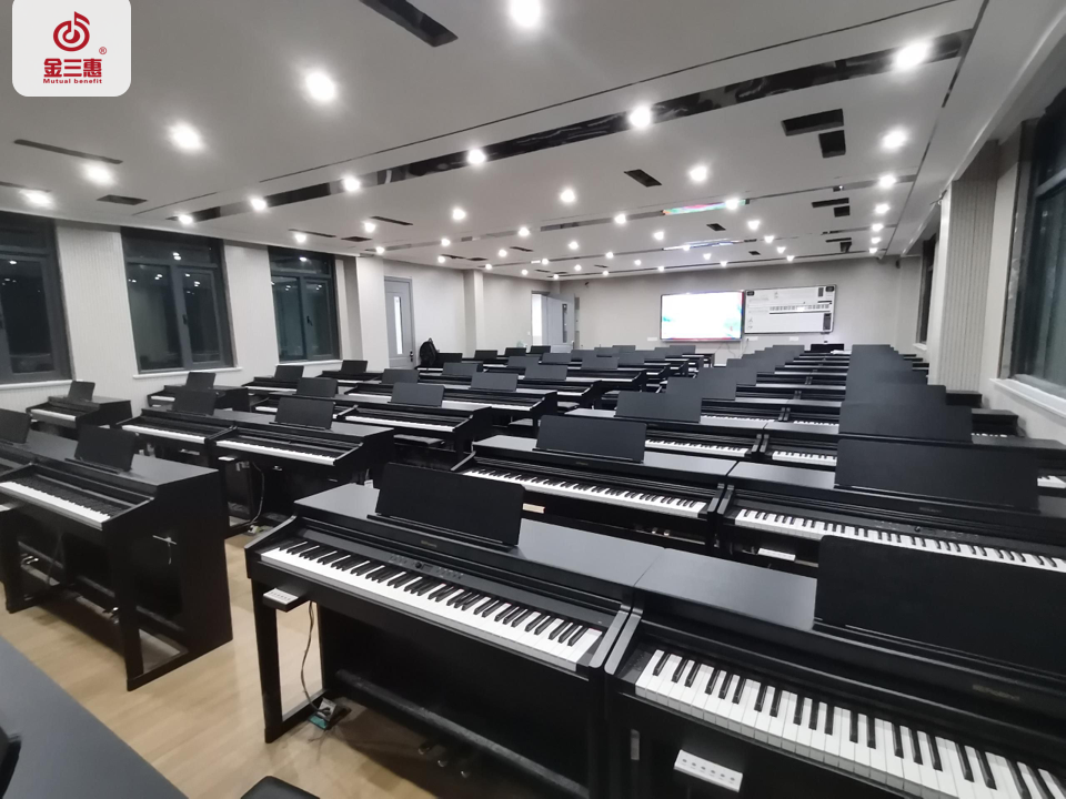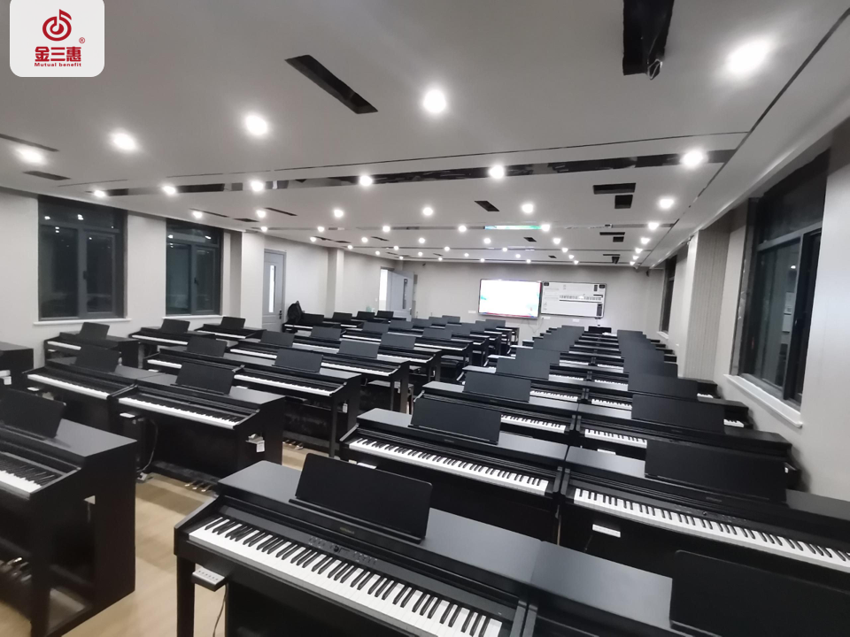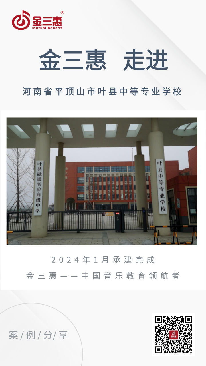 2024年1月,金三惠數字音樂教室走進河南省平頂山市葉縣中等專業學校,為學校提供了54+1的電鋼琴教室配備了金三惠電鋼琴教學系統、電鋼琴、數字音樂教學儀等教學教具等。