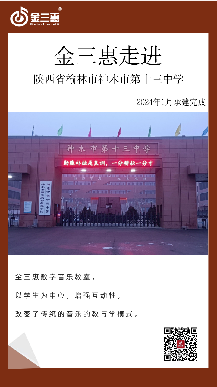 2024年1月,金三惠數字音樂教室為陜西省榆林市神木市第十三中學提供、安裝、培訓的24+1智慧音樂素養教室正式開始使用!配備了金三惠教學系統、電鋼琴、數字音樂教學儀等教學教具。