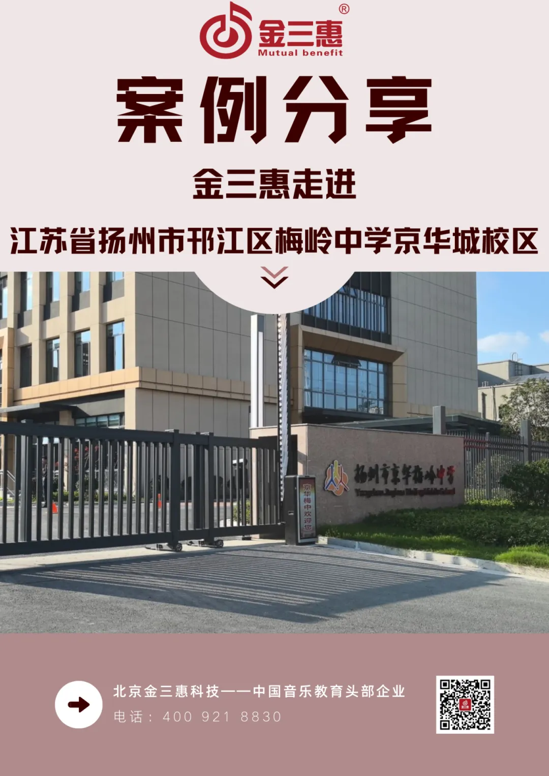 2024年9月,金三惠數字音樂教室走進江蘇省揚州市京華梅嶺中學,為學校提供了1間26+1的電鋼琴教室、1間數字音樂教室、1間合唱教室,配備了電鋼琴、合唱臺、數字音樂教學儀等教學教具等。