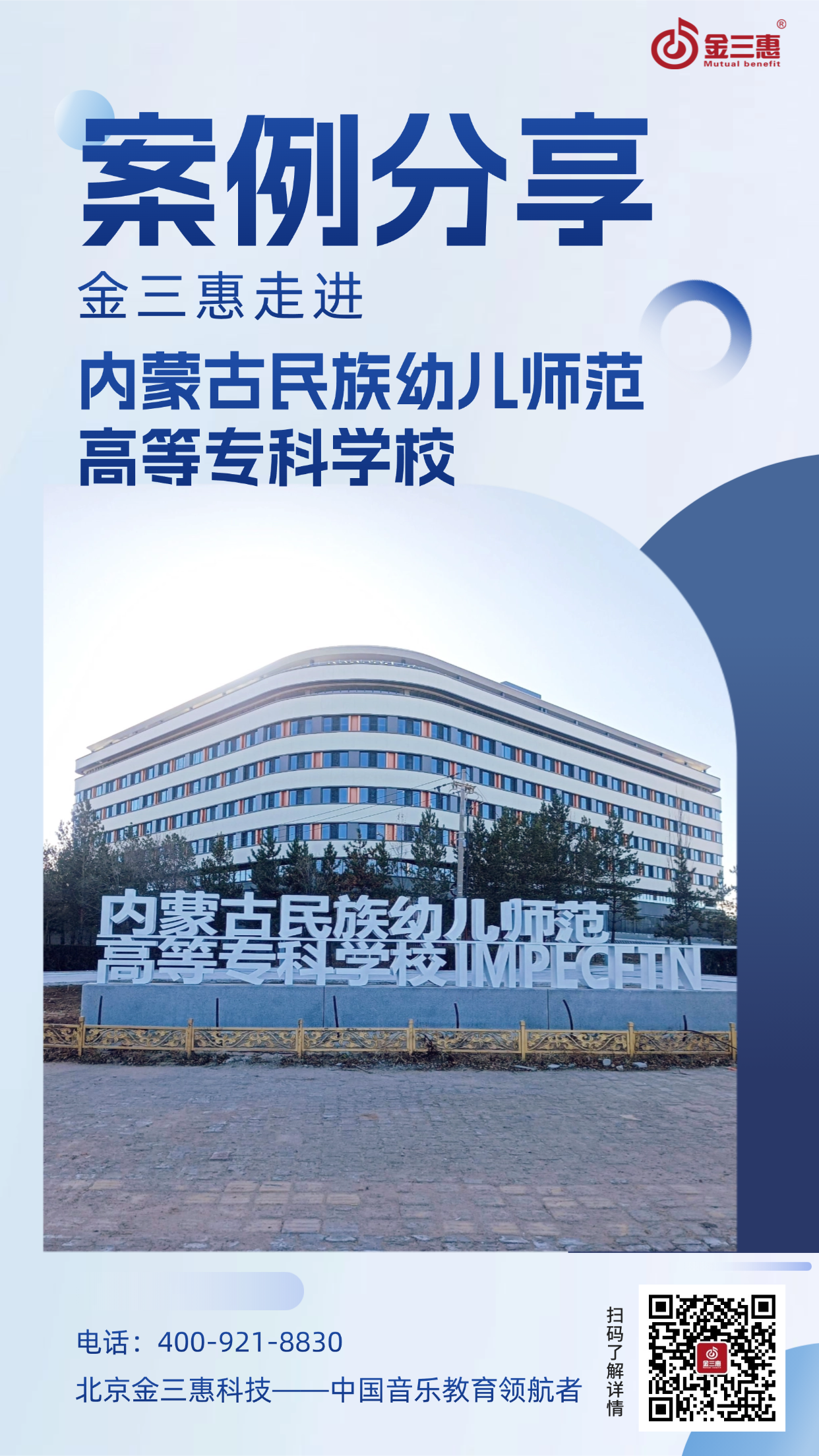 2025年12月,金三惠智慧音樂素養(yǎng)教室正式落地內(nèi)蒙古民族幼兒師范高等?茖W(xué)校。為學(xué)校提供了54+1的智慧音樂素養(yǎng)教室,配備了金三惠數(shù)字音樂教學(xué)系統(tǒng)、電鋼琴、數(shù)字音樂教學(xué)儀等教學(xué)教具等。
