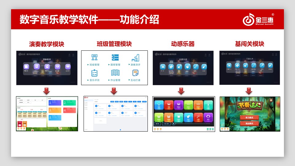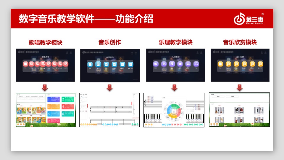 金三惠更好地響應國家教育部關于教育信息化發展工作,北京金三惠科技有限公司作為國內領先的音樂教育的自主研發、生產、銷售為一體的服務商,提供《新常態、音樂教室、整體解決方案》,解決關于學校音樂教學的提升建設、教學特色發展以及教學資源全覆蓋等需求。針對各標準的出臺,新研發出《數字音樂創客教學管理系統》《音樂素養訓練系統》《音樂測評訓練系統》《音樂測評組卷系統》《音樂專遞課堂教學軟件》《電鋼琴教室教學管理軟件》等十幾種音樂教育教學管理系統,滿足不同學校需求,全方面促進全國音樂教育素養的提升,金三惠一直為同在藍天下共享音樂夢而奮斗。