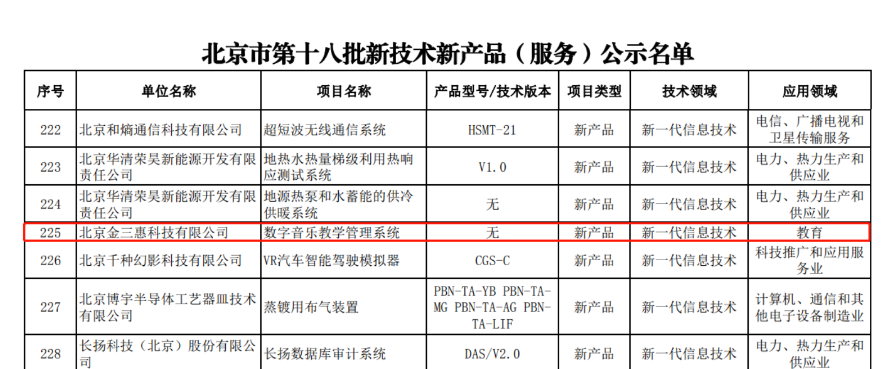 近日,根據《北京市新技術新產品(服務)認定管理辦法》(京科發〔2014〕622號)規定,金三惠“數字音樂教學管理系統”榮獲由北京市科學技術委員會、中關村科技園區管理委員會、北京市科學技術委員會、中關村科技園區管理委員會等5部門聯合頒發的北京市第十八批新技術新產品(服務)認證。