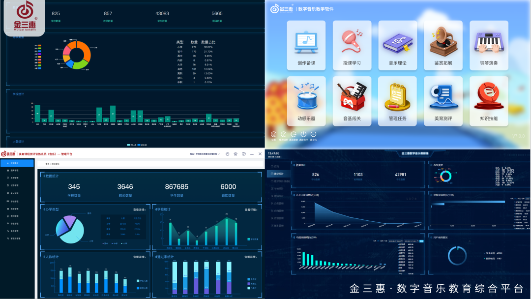 金三惠數(shù)字音樂教育綜合平臺由音樂教學(xué)軟件平臺、音樂測評訓(xùn)練平臺、數(shù)字教學(xué)資源、數(shù)字音樂管理平臺組成,打造了智慧平臺+智能硬件+數(shù)字資源+智能管控+教學(xué)評價(jià)的全場景教育生態(tài),覆蓋音樂教育全學(xué)段、多場景、多角色。