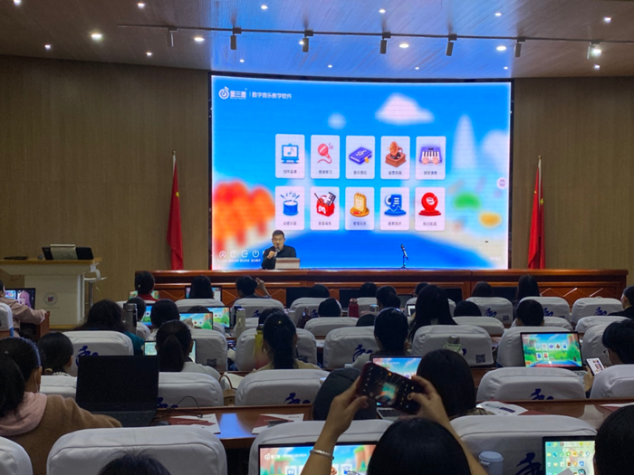 此次培訓(xùn)由海南省北斗小學(xué)鄧丕錦老師主持,陵水縣教研培訓(xùn)中心藝術(shù)教研員劉莎老師指導(dǎo),北京金三惠教研部主任劉浩然老師主講,為全縣中小學(xué)音樂(lè)教師帶來(lái)了一場(chǎng)理論與實(shí)踐相結(jié)合的數(shù)字化教學(xué)培訓(xùn)。