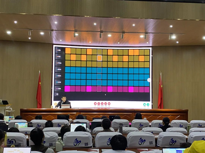 劉浩然老師帶領(lǐng)現(xiàn)場(chǎng)老師共同擊打節(jié)奏曲譜,這種節(jié)奏很難做到準(zhǔn)確的擊打,但運(yùn)用軟件中的節(jié)奏鼓機(jī)可以很好的簡(jiǎn)化這一環(huán)節(jié),將曲譜做成可視化方塊,并通過(guò)不同音色的播放,使節(jié)奏在視聽結(jié)合的方式下變得容易。日常教學(xué)中運(yùn)用這個(gè)功能可以簡(jiǎn)化工作流程,提高老師的工作效率。