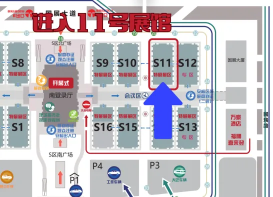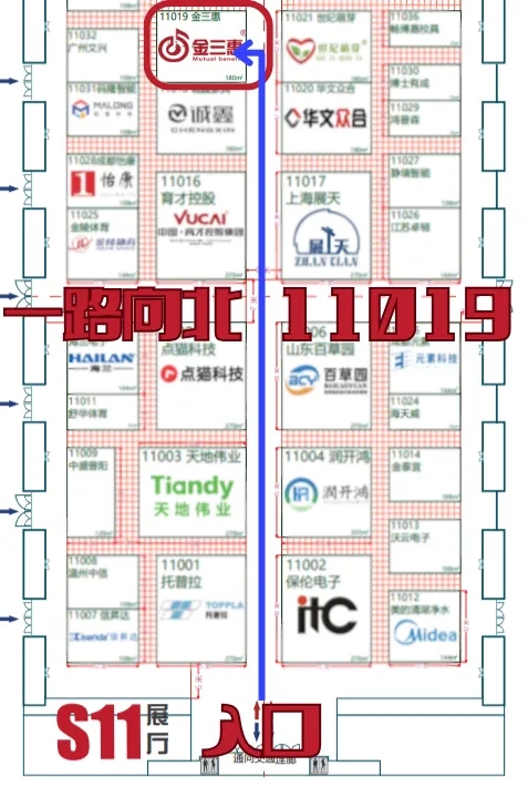 從國家會展中心(天津)南登錄廳向東進入11號館,之后一路向北直達11019金三惠展位。