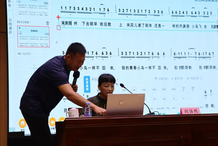 實操演練環節,劉浩然老師先是現場邀請了一位教師上臺,對經典歌曲《青春舞曲》進行改編,融入泉州地域特色元素。