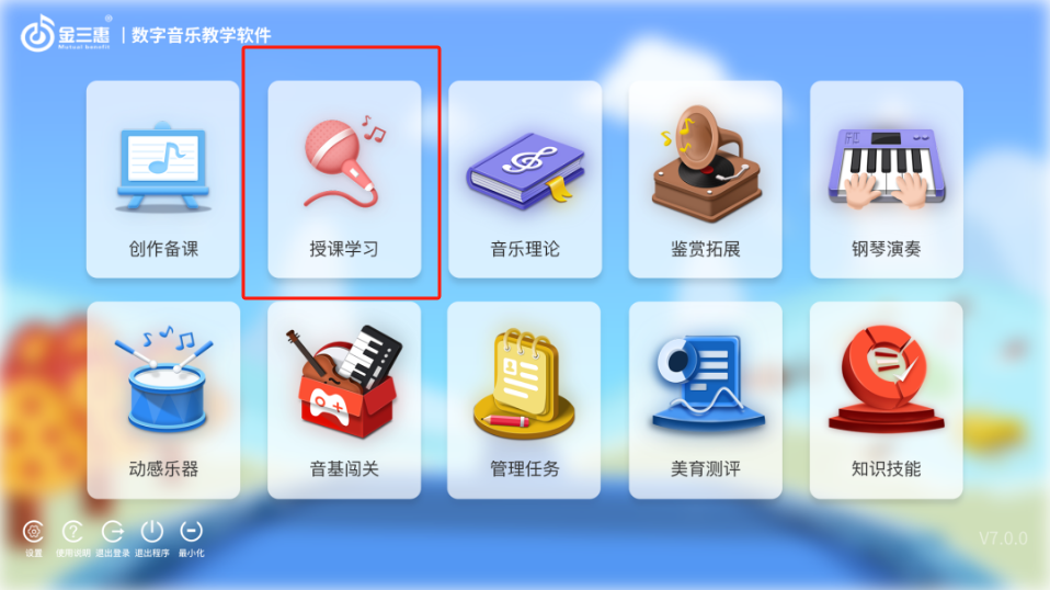 金三惠數字音樂教學軟件首頁,點擊頁面【授課學習】圖標,進入學習頁面,點擊頁面下方的【調】,變調包括:升全音、升半音、降全音、降半音等,老師們可以根據自己的班級,選擇適合的音調,進行教學哦~
