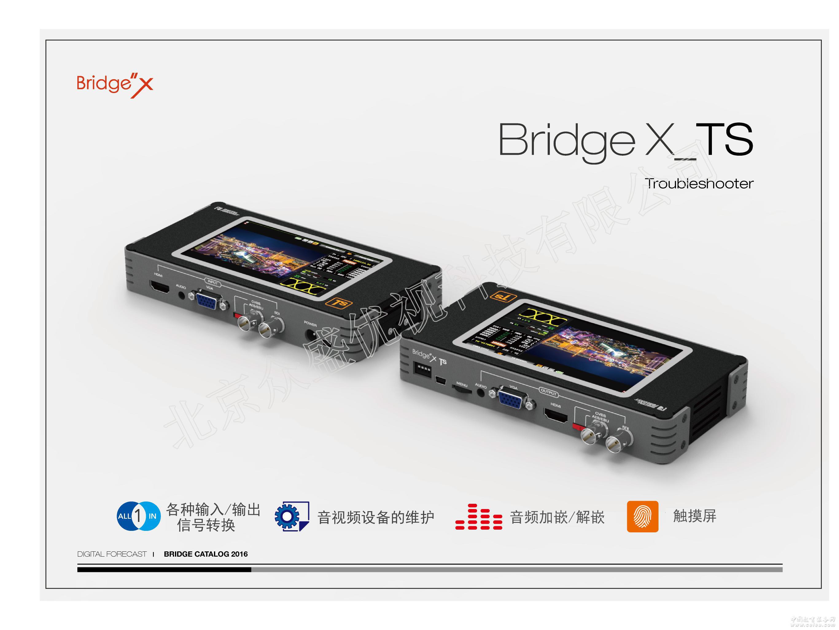 產品詳細介紹Bridge X TS 是一臺支持多種信號輸入和輸出的設備,它可用于視音頻信號的安裝調試和日常維護,支持L CD 液晶屏顯示信號圖像及其狀態。任何輸入信號,都可以轉換成多種信號輸出,同時具有測量SDI信號眼圖、波形圖和顯示線纜長度的功能。