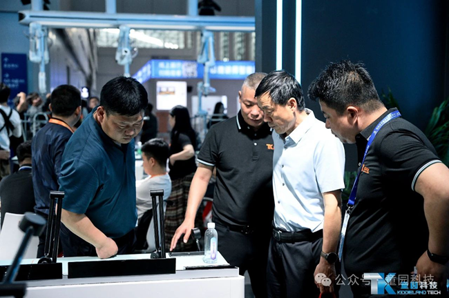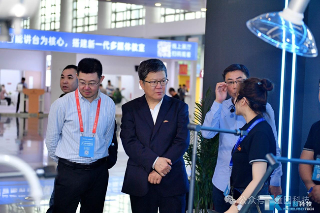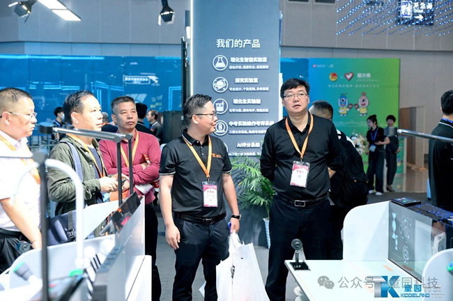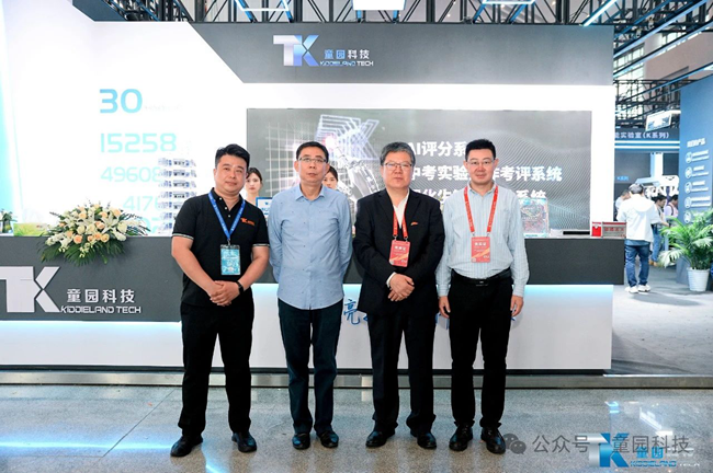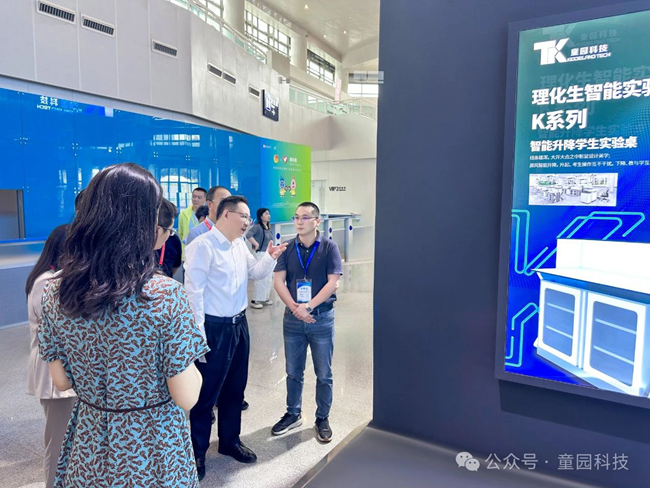 展會首日,參加開幕式的部分領導、嘉賓蒞臨童園科技展位參觀指導,廣東童園科技有限公司副總經理胡剛向各位領導嘉賓介紹了童園科技新產品和全新的戰略目標。各位領導們對童園科技理化生智能實驗室、中考實驗操作考評系統、AI評分系統等教育信息化系列產品給予了高度評價;并充分肯定了童園科技以科技引領潮流,智慧驅動創新與教育改革深度融合的戰略發展方向。