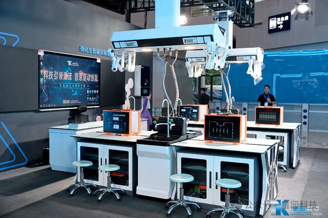 通過1:1模擬理化生實驗室環境,展出了童園科技理化生智能實驗室所包含的智能吊裝系統、物聯智控系統、教師升降演示臺及學生實驗桌等核心組成設備。