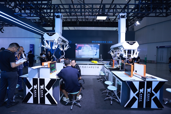 第83屆中國教育裝備展示會上,童園科技理化生智能實驗室、中考實驗操作考評系統、AI評分系統等教育信息化系列產品。