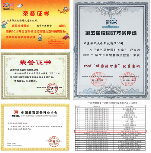此前,華文眾合“數字書法教學”項目榮獲2018全國科技周暨北京科技周活動主場最受公眾喜愛項目;華文眾合智慧書法教室榮獲2018“校園好方案”優秀案例;2019年華文眾合智慧書法教室被評為第76屆中國教育裝備展示會金獎產品,連續入選2018、2020中國教育裝備行業協會年度推薦產品。