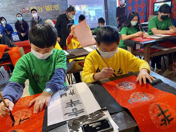 南投縣魚(yú)池小學(xué)學(xué)童完成書(shū)法春聯(lián)后,透過(guò)遠(yuǎn)程屏幕和大陸練市小學(xué)的師生們展示,別有寓教于樂(lè)的意義。