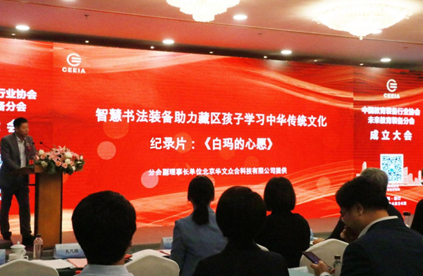 未來教育裝備分會大型公益捐贈活動同期舉行。活動現場,首先觀看由北京華文眾合有限公司出品的國內首部智慧書法進藏紀錄片《白瑪的心愿》。該影片記錄通過將智慧書法教室運用到西藏孩子們的課堂,真正將科技化、信息化的傳統書法教育進行了深度實踐,藏族孩子們通過智慧書法教室,在對書法產生了濃厚的學習興趣的同時,也對傳統書法文化有了進一步的了解。這是對傳統書法教學難題的突破,是對弘揚傳統書法文化的一次有效嘗試。