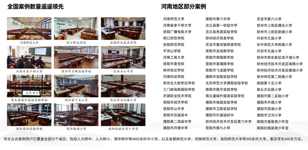 華文眾合第8代智慧書法教室解決書法教學書法師資欠缺、書法課程體系欠缺等難題的同時,也是在助力傳統文化教育,提升學生的傳統文化素養、讓傳統文化不斷層,讓學生得到中華優秀傳統文化的滋養,認識到漢字、傳統文化的偉大,從小培養文化自信。目前,華文眾合智慧書法教室已走進全國4000多所中小學以及300多所大學,包括清華大學附屬中學、中國人民大學附屬中學、中國人民大學附屬小學、首都師范大學等名校。在河南地區也擁有眾多用戶案例,例如河南師范大學、河南省老干部大學、濮陽市外國語初中、鄭州龍子湖小學等等。