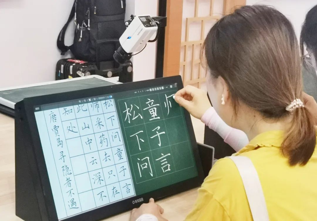 展會現場迎來了一群可愛的小學生,在華文眾合智慧書法教室中上了一堂科技感十足的書法課