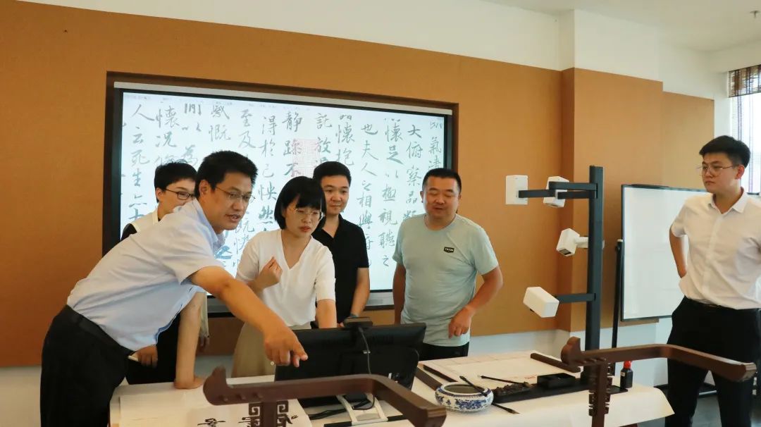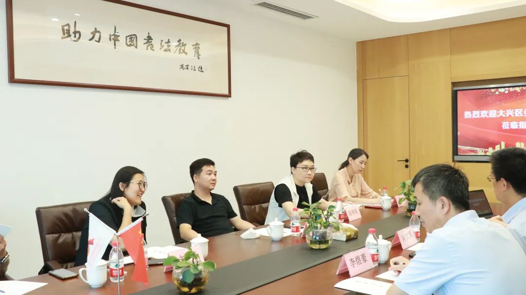 7月6日,大興區(qū)委宣傳部副部長孟偉、宣傳部副部長高偉英(掛職)、大興區(qū)委宣傳部文促中心主任劉婧、大興經(jīng)開區(qū)開發(fā)經(jīng)營有限公司服務(wù)專員部經(jīng)理邢潔及相關(guān)負責(zé)同志到訪北京華文眾合科技有限公司調(diào)研,與華文眾合董事長向大鳳等企業(yè)相關(guān)領(lǐng)導(dǎo)進行座談交流,實地考察華文眾合第8代智慧書法教室。