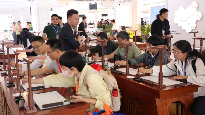 觀眾對華文眾合智慧書法充滿好奇與熱情,紛紛前來體驗。現場書寫,AI 即時生成專業測評,感受智慧書法教學的魅力。