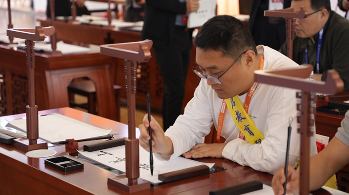 教育部關心下一代工作委員會常務副主任王富現場背誦《蘭亭序》全文,觀眾云集,掌聲雷動,將展會氛圍推向高潮。