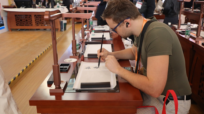 小朋友和外國友人也被吸引過來體驗智慧書法,傳統文化的種子不僅在孩子們心中悄悄萌芽,也通過外國友人散播到世界各地。