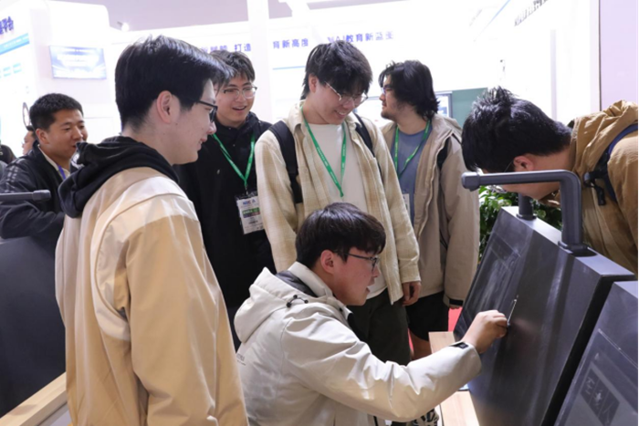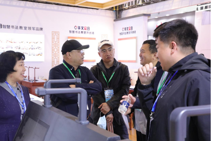 展會上,第九代智慧書法教室備受矚目,吸引無數參會者駐足。無論是教育工作者、高校領導,還是對書法教育感興趣的社會人士,紛紛來到展位了解智慧書法,并深度體驗AI評測、AI握筆姿勢監測、AI筆尖跟蹤等功能。