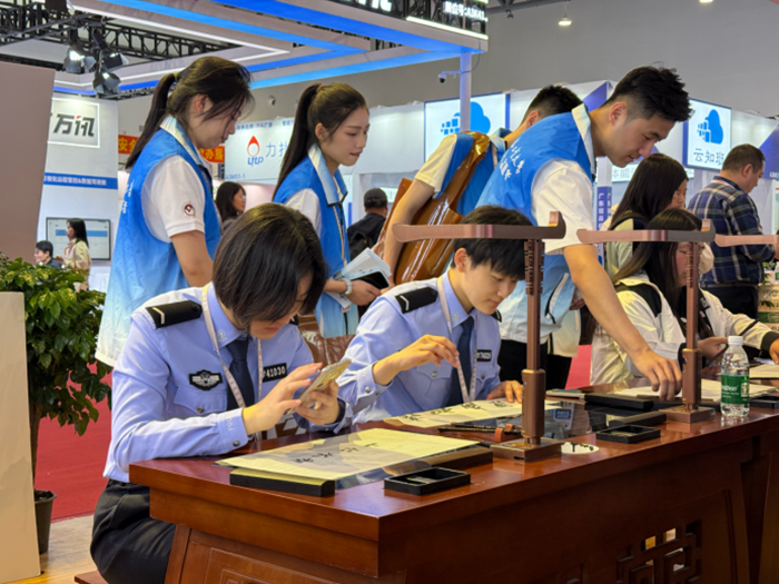 負責本次展會安全的公安警察,以及為展會提供服務的志愿者們,在忙碌間隙也被華文眾合展位的熱鬧氛圍吸引而來,紛紛坐下來體驗智慧書法的魅力。
