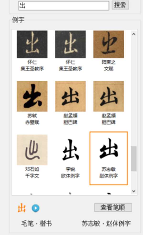 (4)所選單字下方會顯示此字的作品來源及書體,可以查看所選單字的筆順及現代字體的書寫視頻;