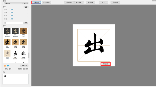 (6)可選擇“邊看邊練”,在字庫里選擇現代書法家字帖,點擊開始練習;