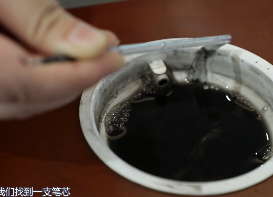 這時候可以尋找身邊合適的工具。我們找到一支簽字筆,取出筆芯,輕輕疏通漏斗口,掏出體積較大的垃圾。
